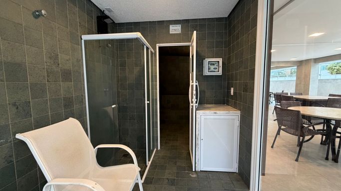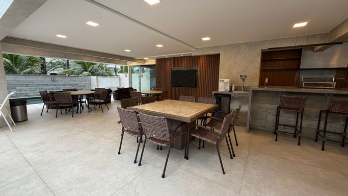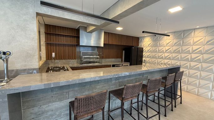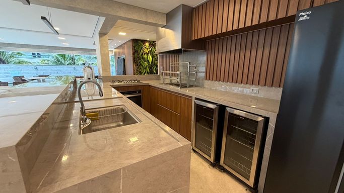 A cozinha é funcional e independente, mantendo a organização do ambiente. A área gourmet é separada, perfeita para receber amigos e familiares com mais privacidade e conforto, sem interferir na rotina da cozinha.