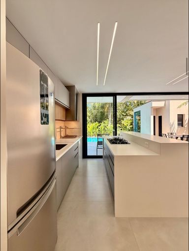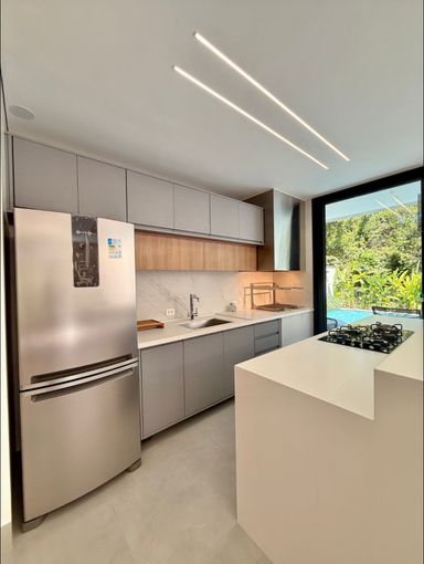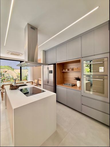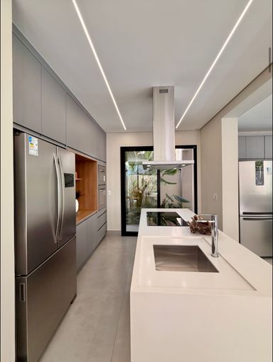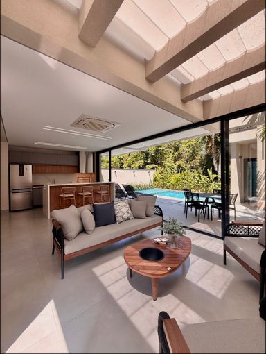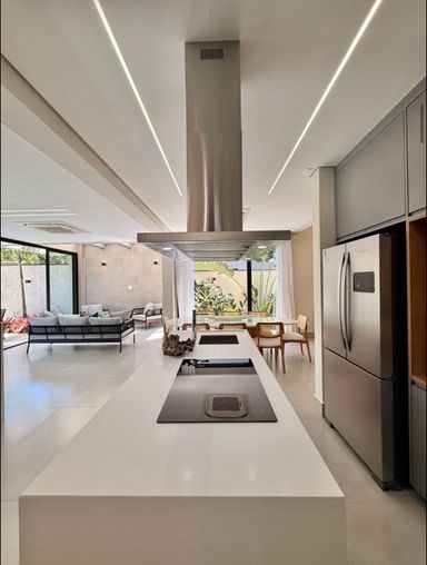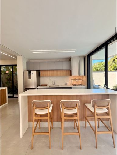 A área gourmet e a cozinha, integradas à casa, são um verdadeiro convite para momentos de convívio.