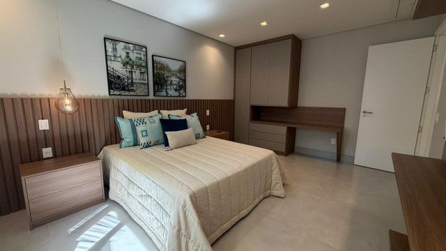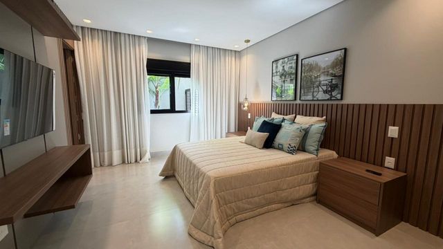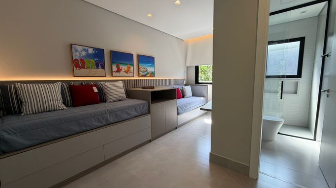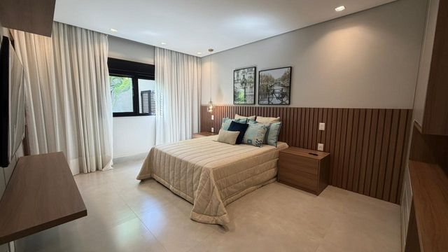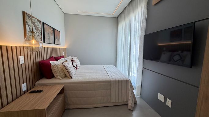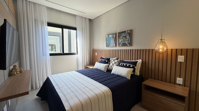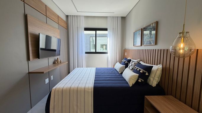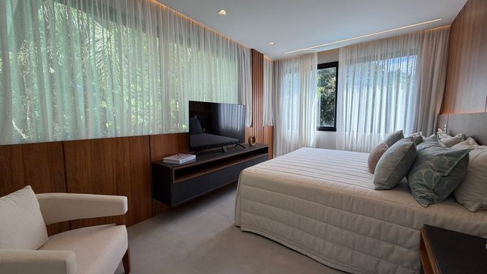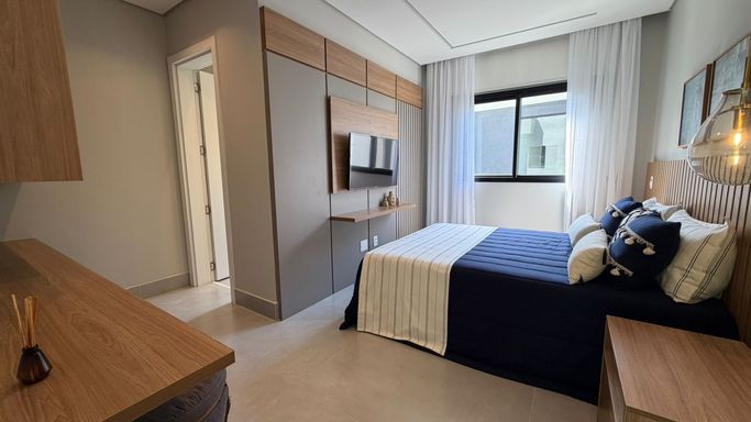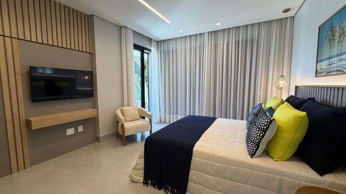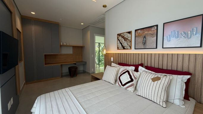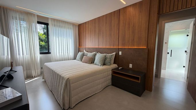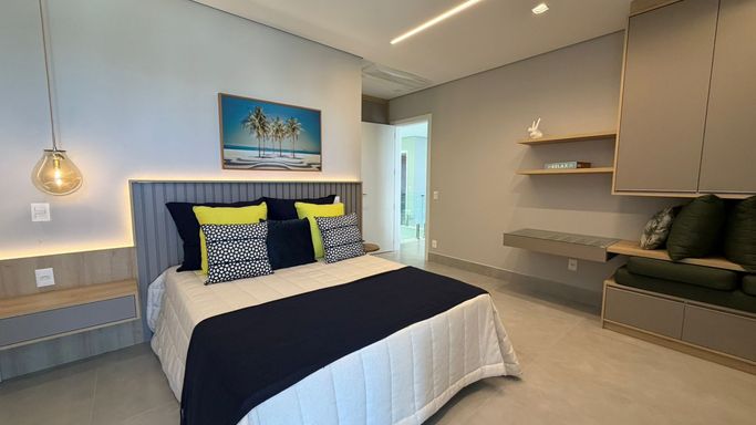 A suíte master se destaca como um refúgio privativo, com amplo espaço e acabamento sofisticado, ideal para momentos de descanso com total conforto.