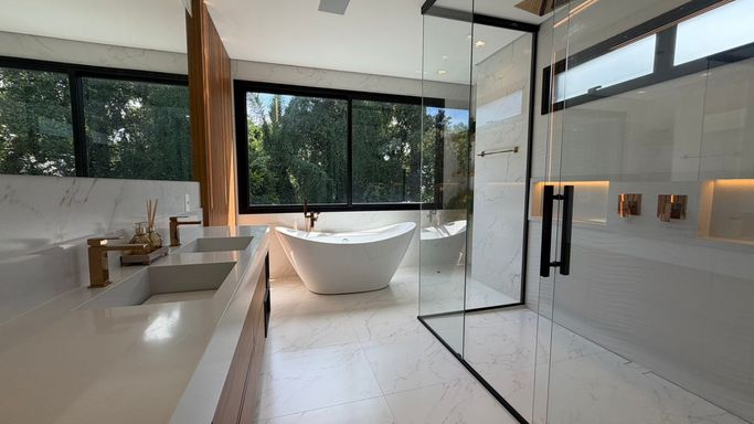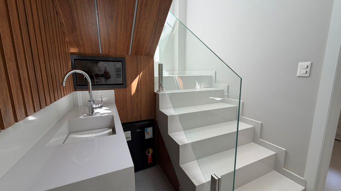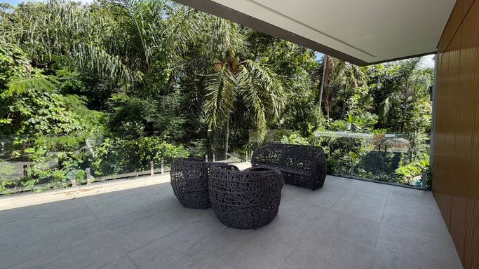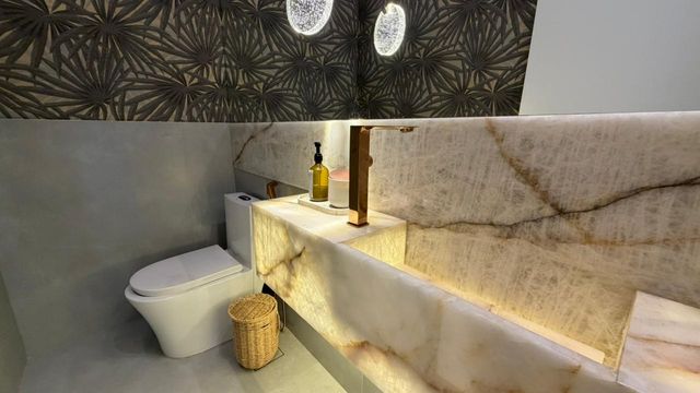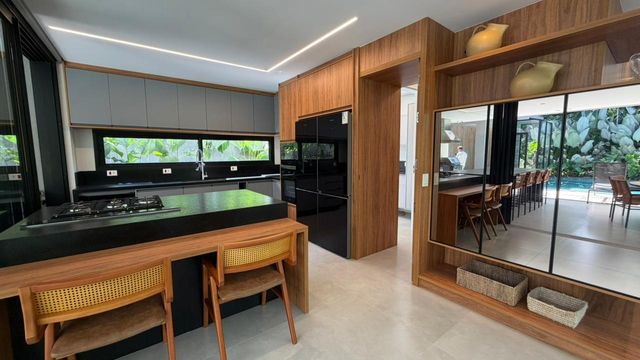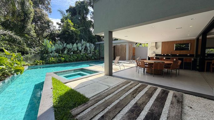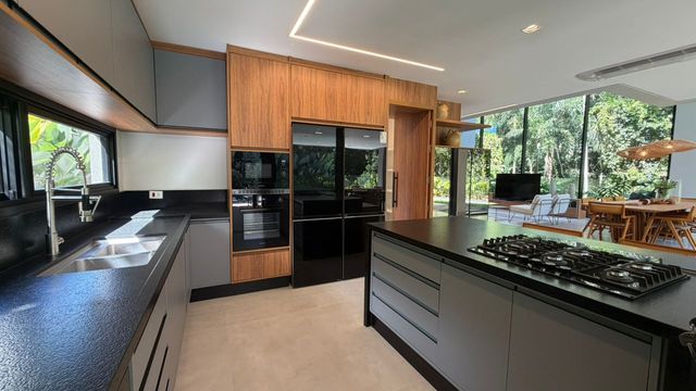 Todos os ambientes são equipados com eletrodomésticos de alta qualidade, garantindo praticidade e alto padrão em cada detalhe. Ao todo, são oito banheiros distribuídos de forma inteligente, atendendo com conforto tanto as áreas sociais quanto as íntimas.