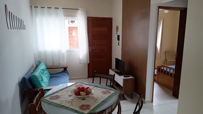 Casa com 2 dorms., sala, cozinha com balcão amer., 1 banheiro e área privativa com churrasqueira e ducha fria, 2 vagas e um portão de fácil acesso à garagem. O condomínio tem acessibilidade, piscina com banheiro e uma área kids ao lado, 1 box individual para guardar bikes e coisas de praia, monitoramento por câmera, numa rua tranquila e sem saída.